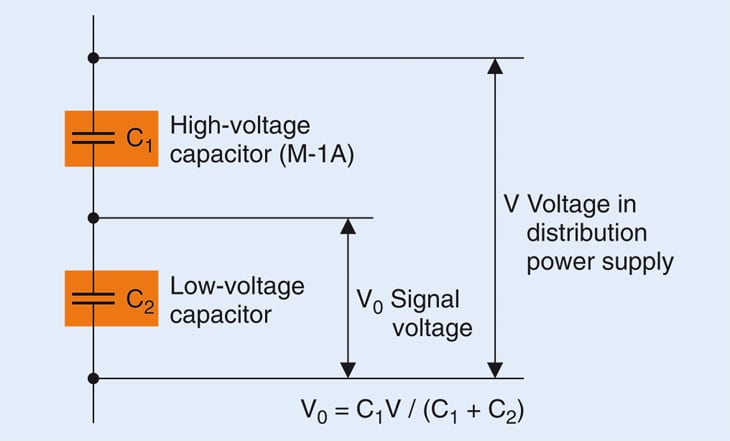 The basic configuration of a voltage sensor is shown in Figure 2. The circuit consists of a high-voltage capacitor and a low-voltage capacitor connected in series. In order to be able to accurately detect voltage variations in the distribution lines, the electrical properties of high-voltage capacitors used in voltage sensors must be unaffected by surrounding temperature or voltage levels. The high-voltage capacitor must exhibit no capacitance changes at temperatures from -20 to +70 °C and up to distribution voltages of 3810 VRMS; low-voltage capacitors must also have similar characteristics. Additionally, the capacitors must be small enough that 6 each fit in both the input and output of the three-phase line of each switch.